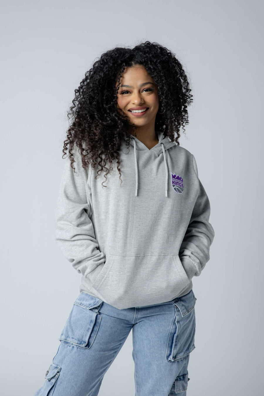 Stay cozy while showing your Kings pride with the Women’s Kings Action Hoodie. Designed with a flattering fit and everyday comfort in mind, this soft gray hoodie features the bold Kings primary logo on the front, adjustable drawstrings, and a classic kangaroo pocket.