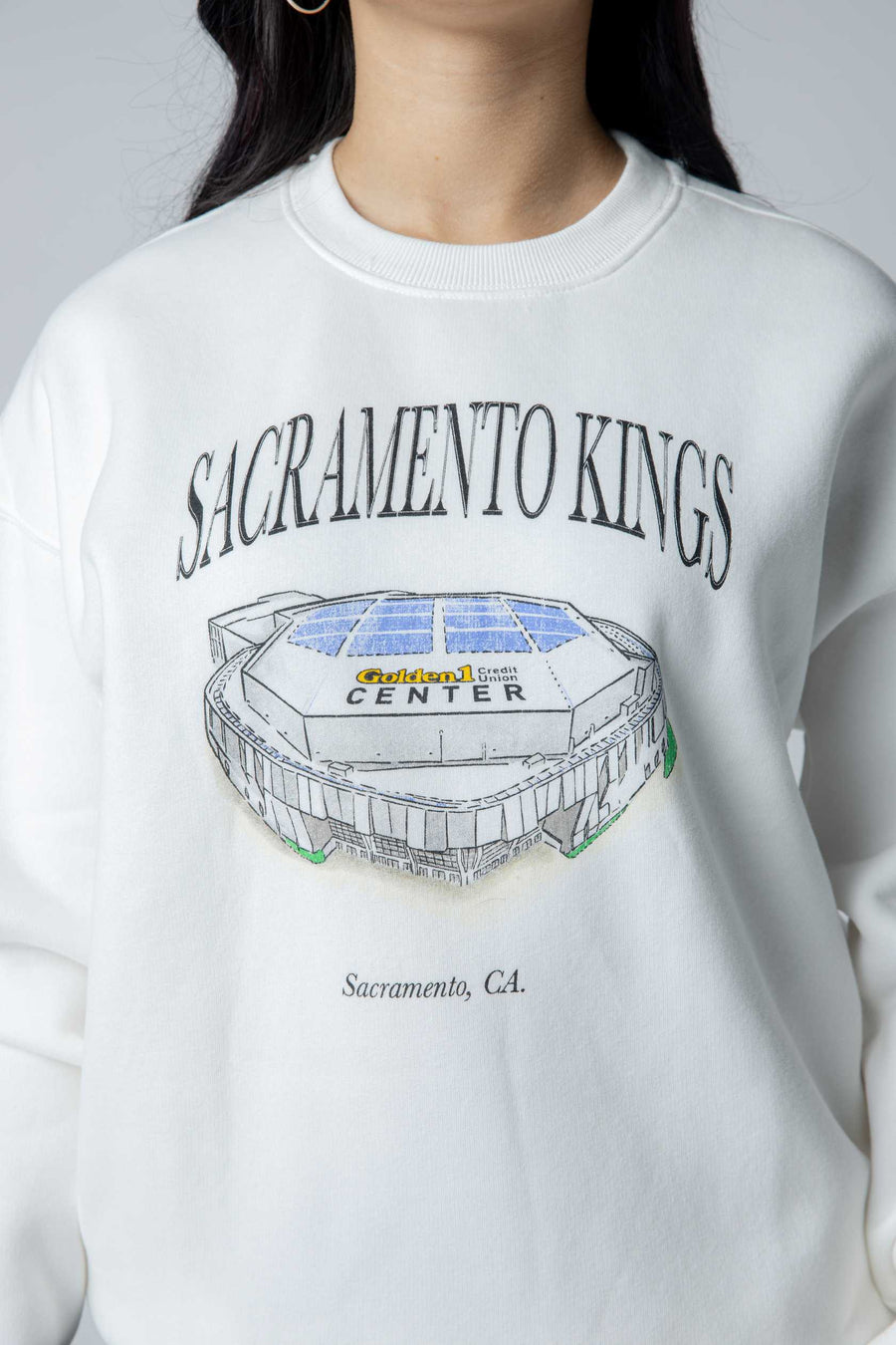 Show your Kings pride with the Classic Era Crew by Hype & Vice, featuring a stylish, minimalist illustration of the Golden One Center. This white crewneck combines comfort with cool, making it perfect for game days or casual wear.