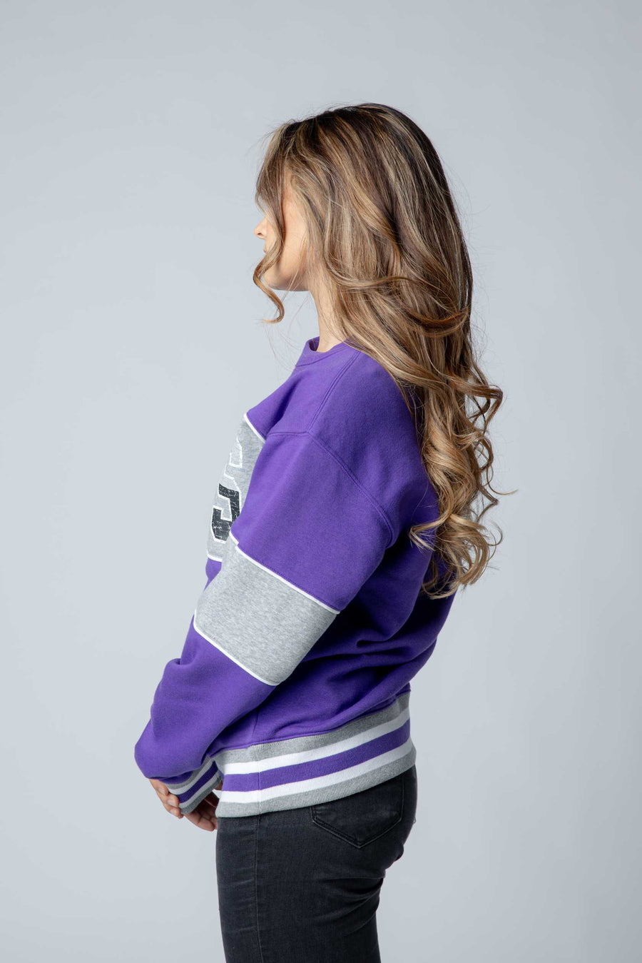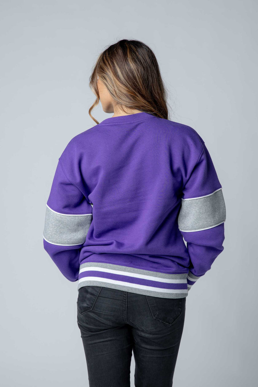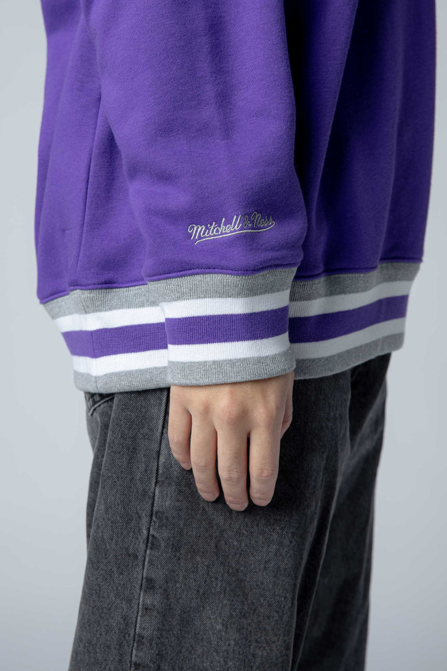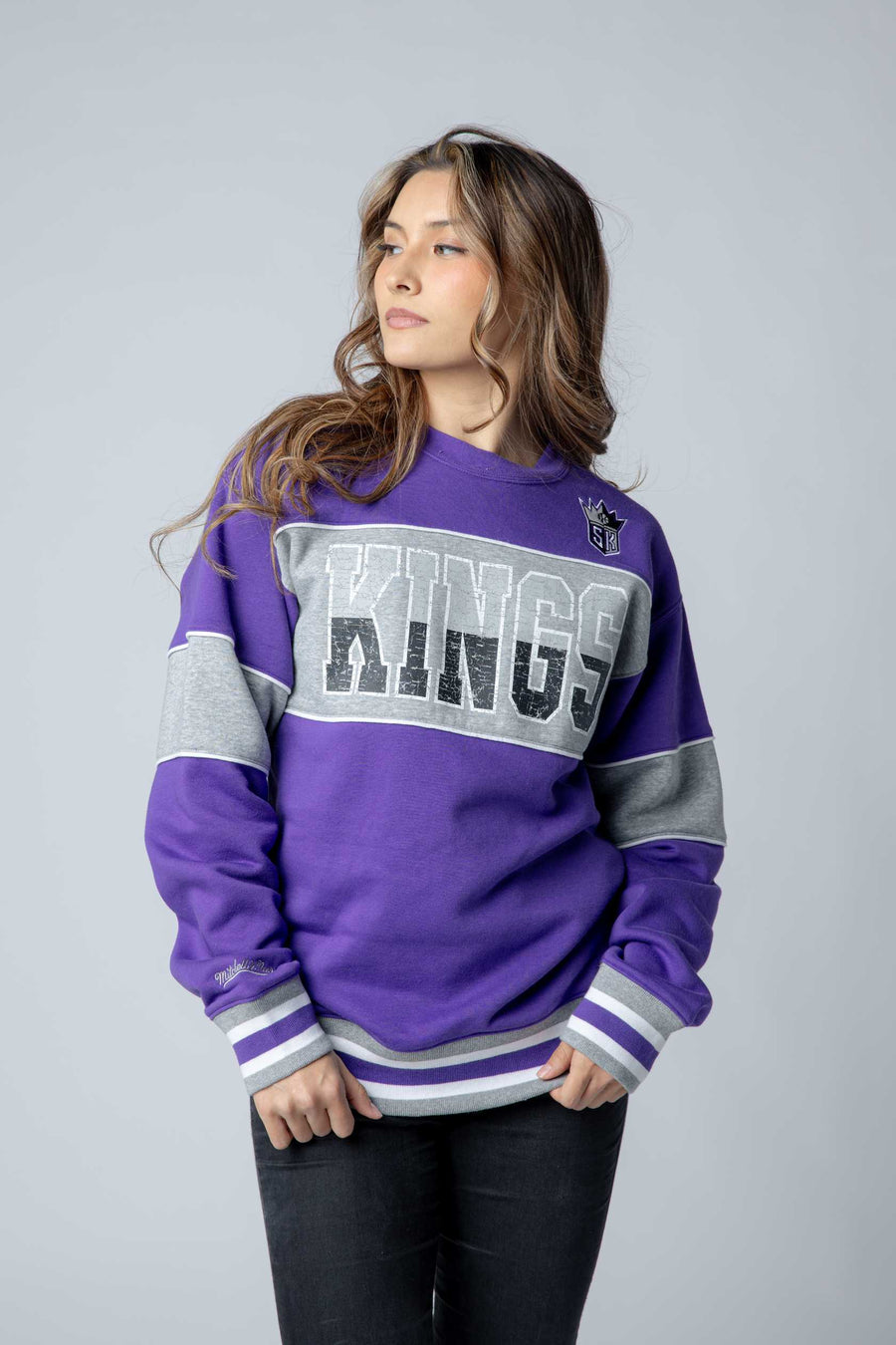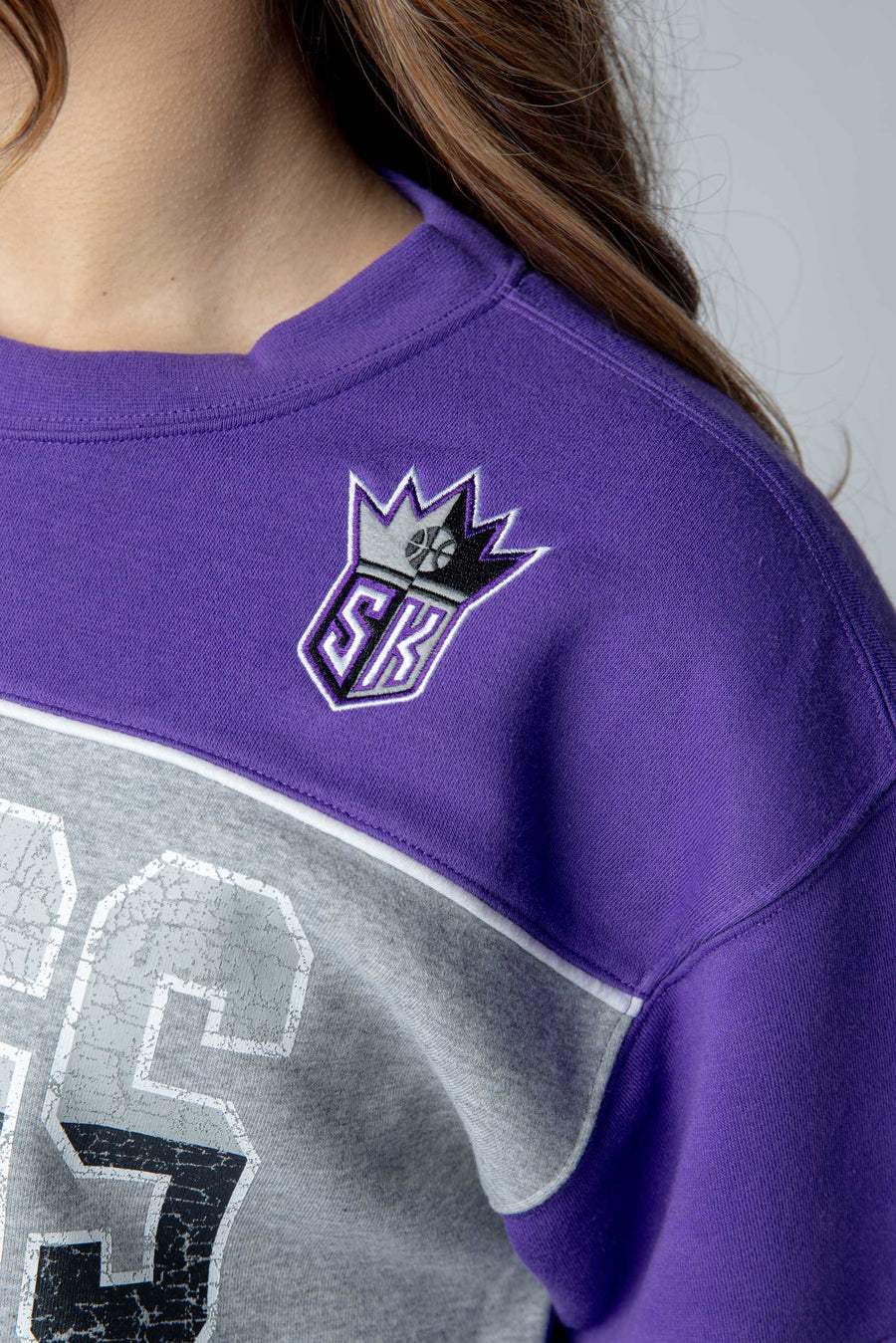 Elevate your Kings pride with this classic Fleece Crew, featuring the old-school logo that honors Sacramento basketball heritage. The grey and purple colorway captures team tradition, while striped detailing on the cuffs and hem adds vintage flair. Soft fleece construction keeps you comfortable whether you're courtside or on the street.