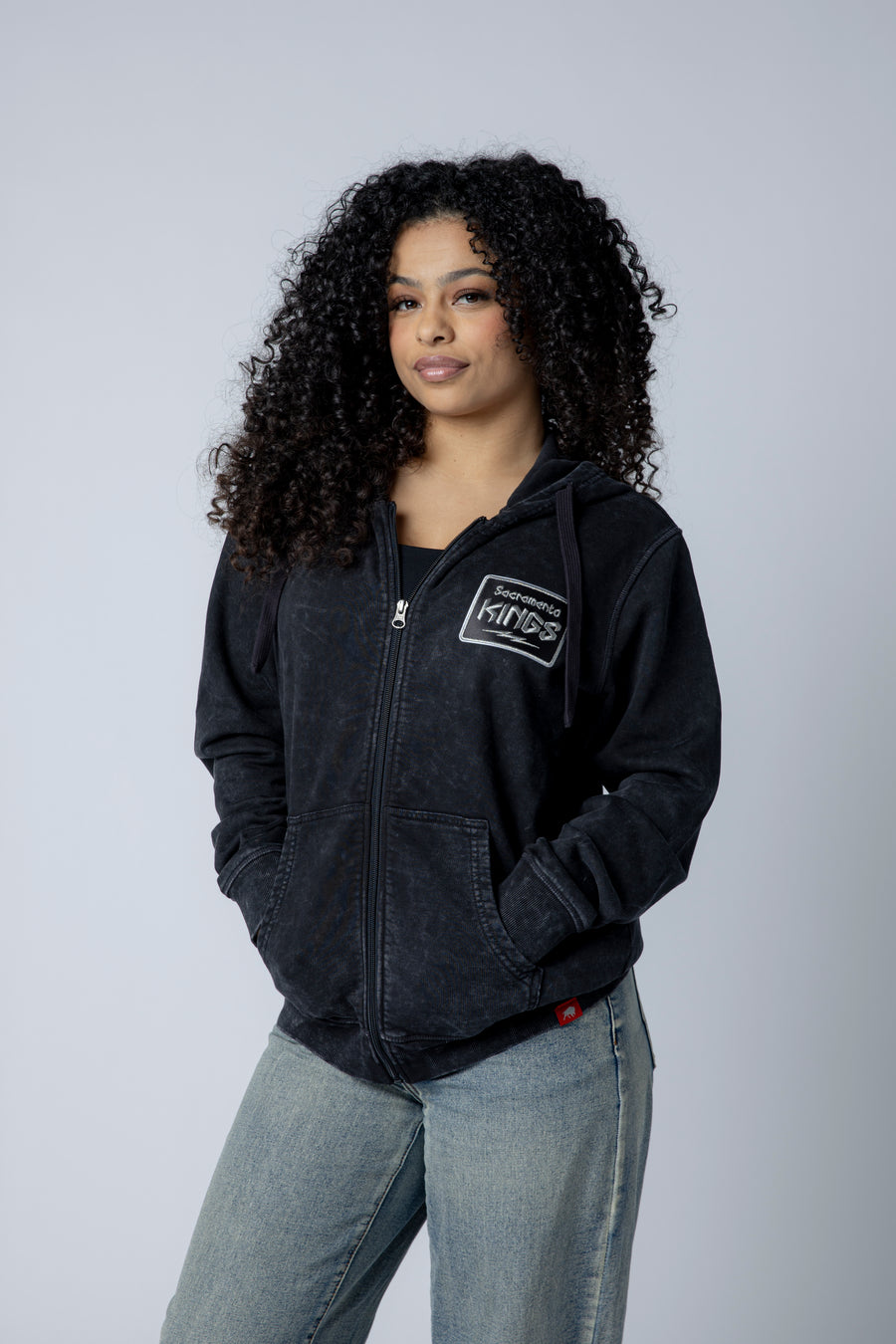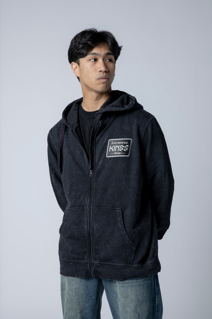 Introducing our Kings Lighting Full Zip by Sportiqe. Crafted from a soft, washed black fabric with a lived-in feel, this full-zip hoodie features a subtle Sacramento Kings patch on the left chest for a clean, vintage-inspired look.