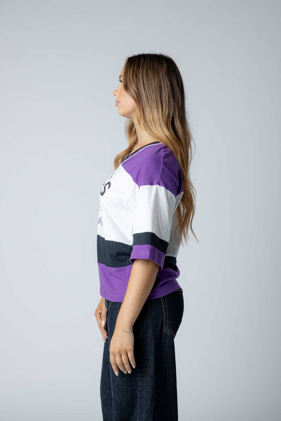 Show your team pride in comfort and style with the Kings Football Jersey Tee. Featuring wider sleeves and a boxier fit, this tee offers a relaxed, modern silhouette ideal for everyday wear. The bold primary logo proudly showcases your support, making it perfect for game day or casual outings. Crafted for both comfort and standout style, this jersey tee keeps you looking sharp while celebrating your favorite team.