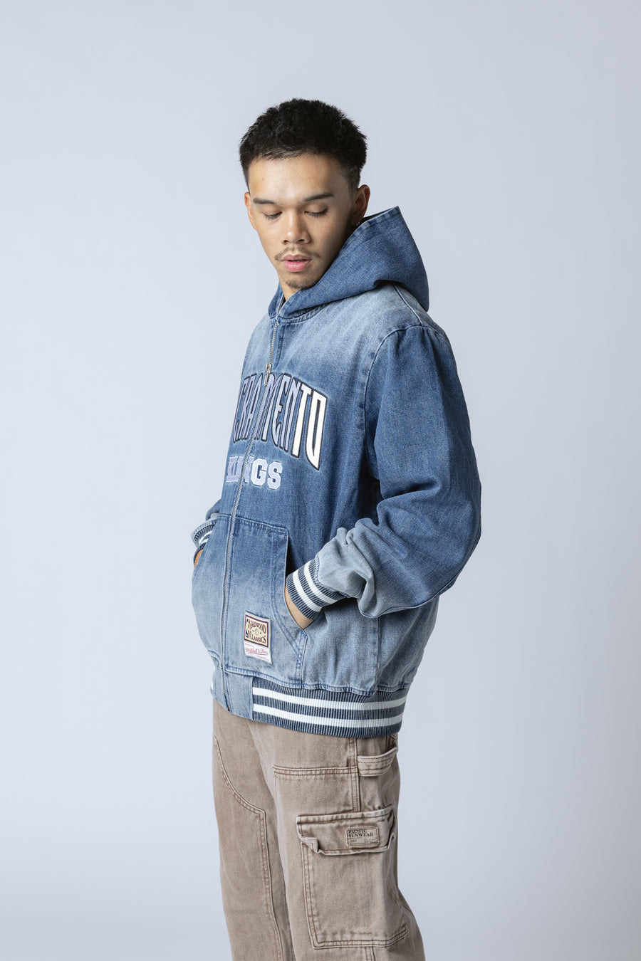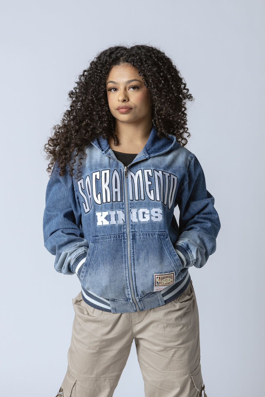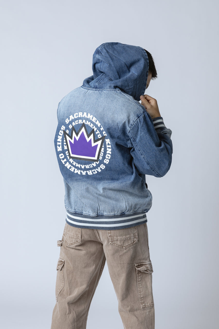 Make a bold statement in the Sacramento Kings Denim Jacket. This heavyweight piece fuses vintage varsity vibes with modern fan style. Featuring bold embroidered “Sacramento Kings” lettering on the front and a standout crown graphic on the back, this Mitchell & Ness jacket is built for those who want to rep the squad in standout fashion. Rib-knit striped trim and a soft interior lining finish off this premium throwback piece.