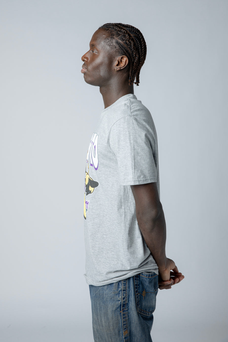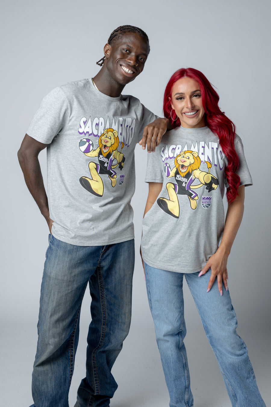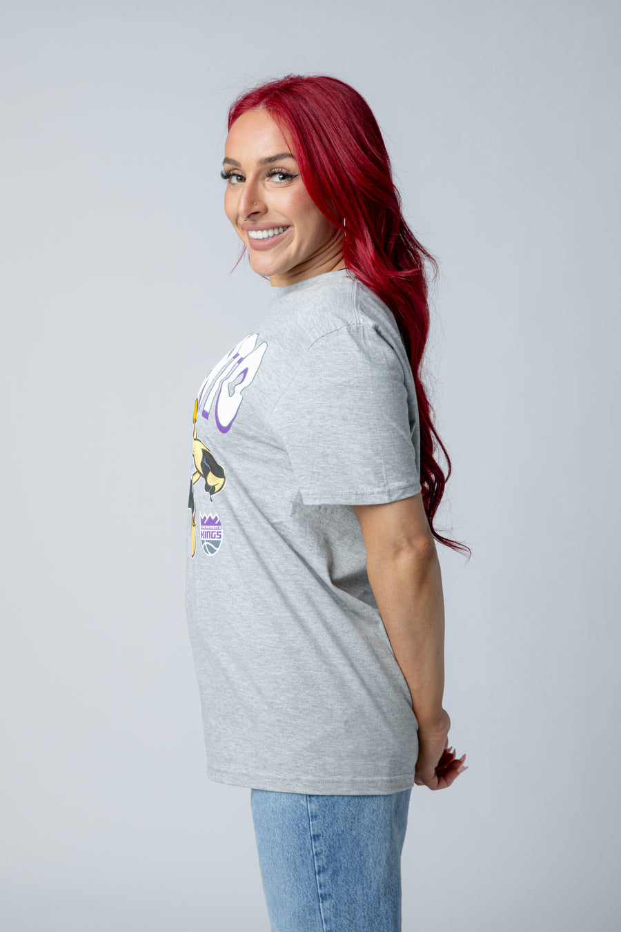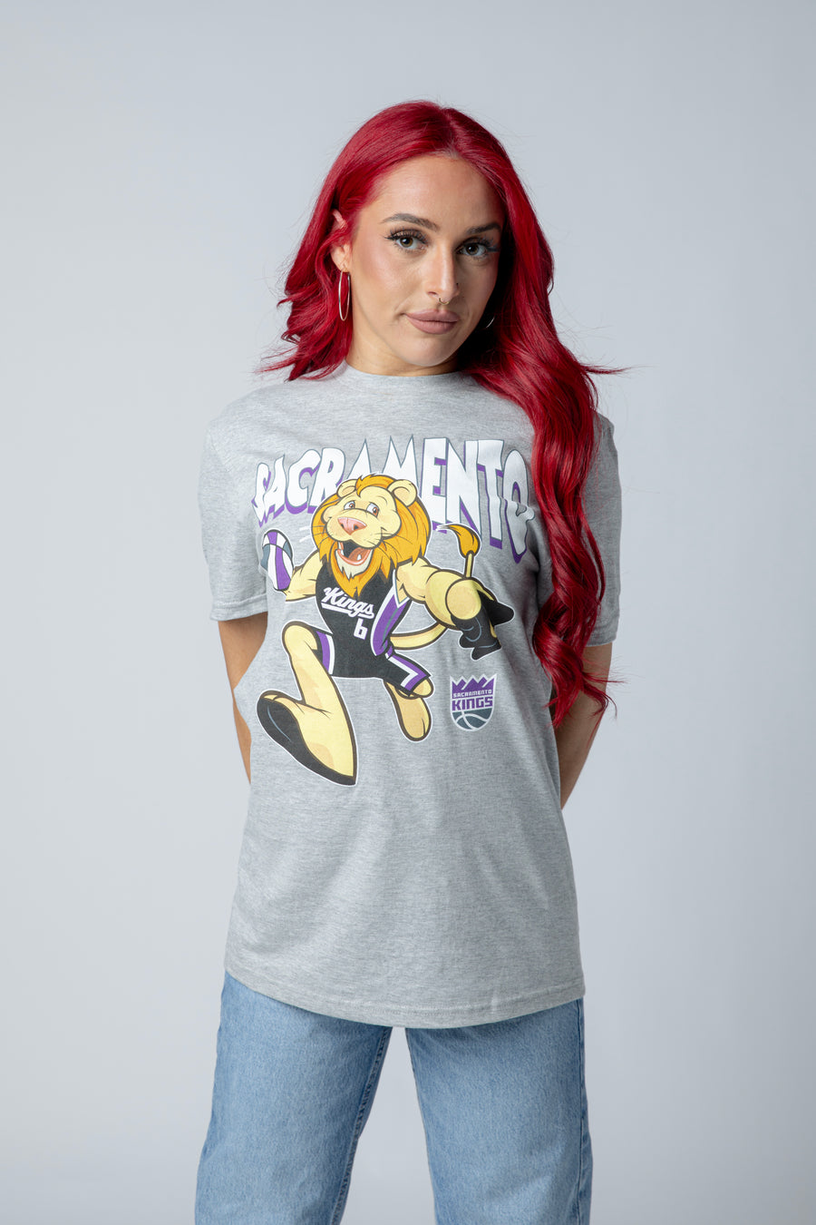 Meet Slamson in action. This heather grey tee features a full front screen print of the Sacramento Kings mascot in his iconic uniform, captured mid-court in vibrant color. Perfect for fans who want to rep the Kings with style and personality.