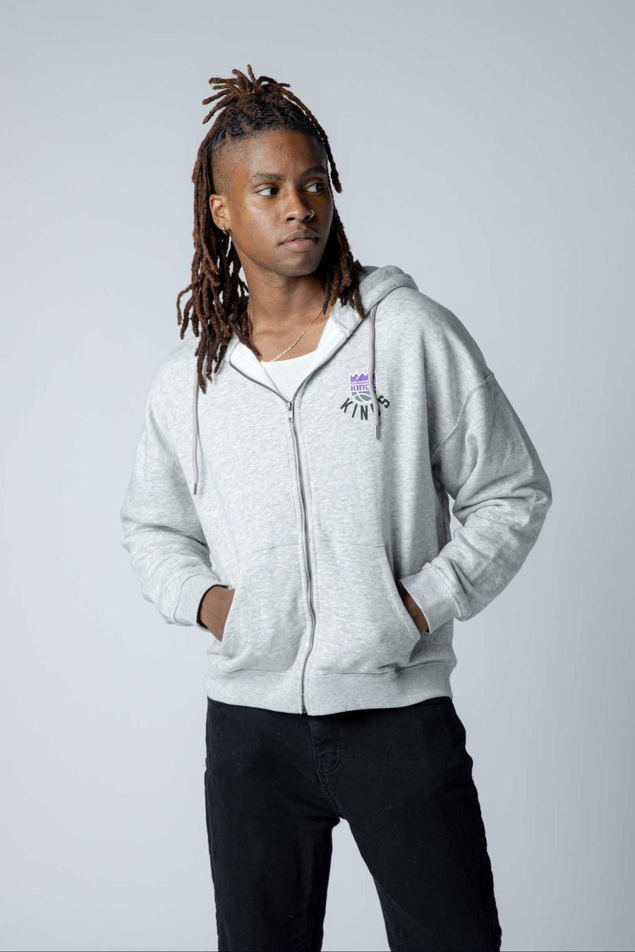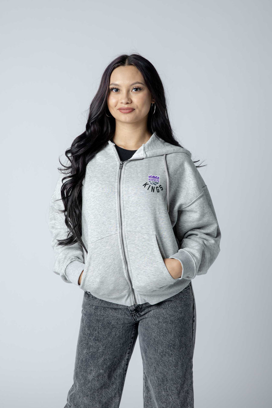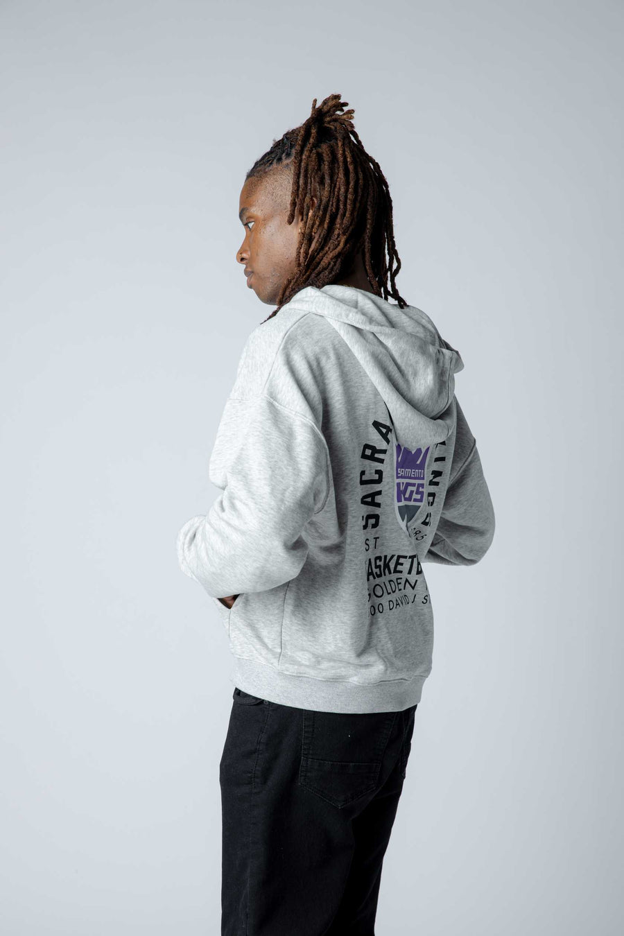 Rep your city in comfort and style with the Kings Team Full-Zip Hoodie. This premium gray layer features the Kings primary logo on the back, framed by stylized arched text for a bold, elevated look that stands out from every angle.