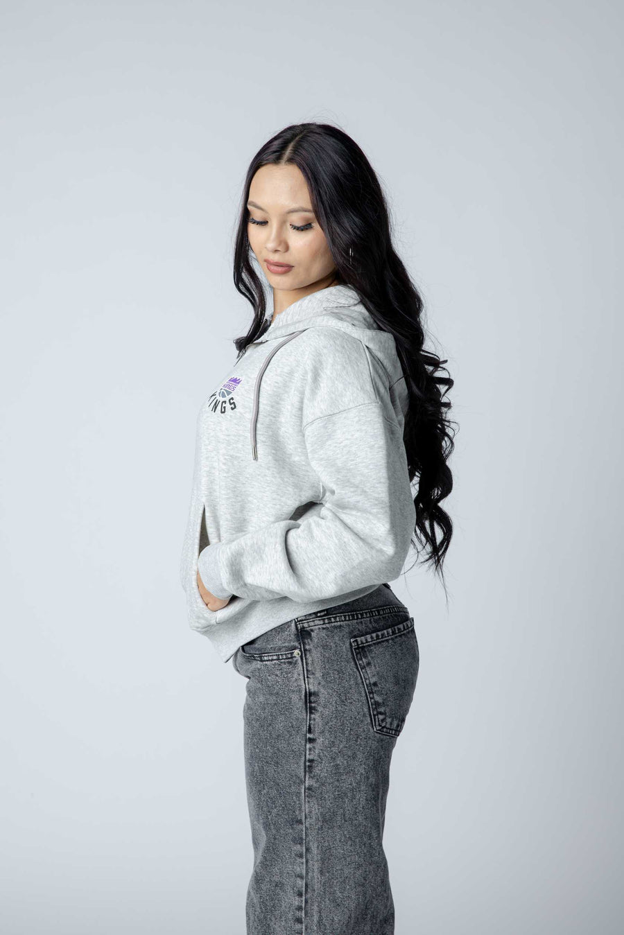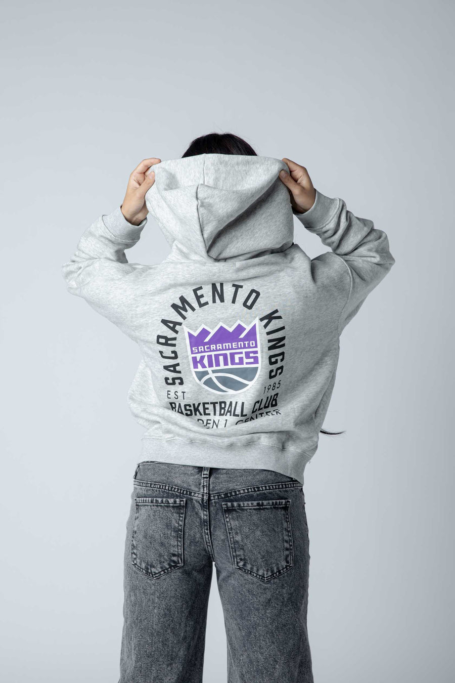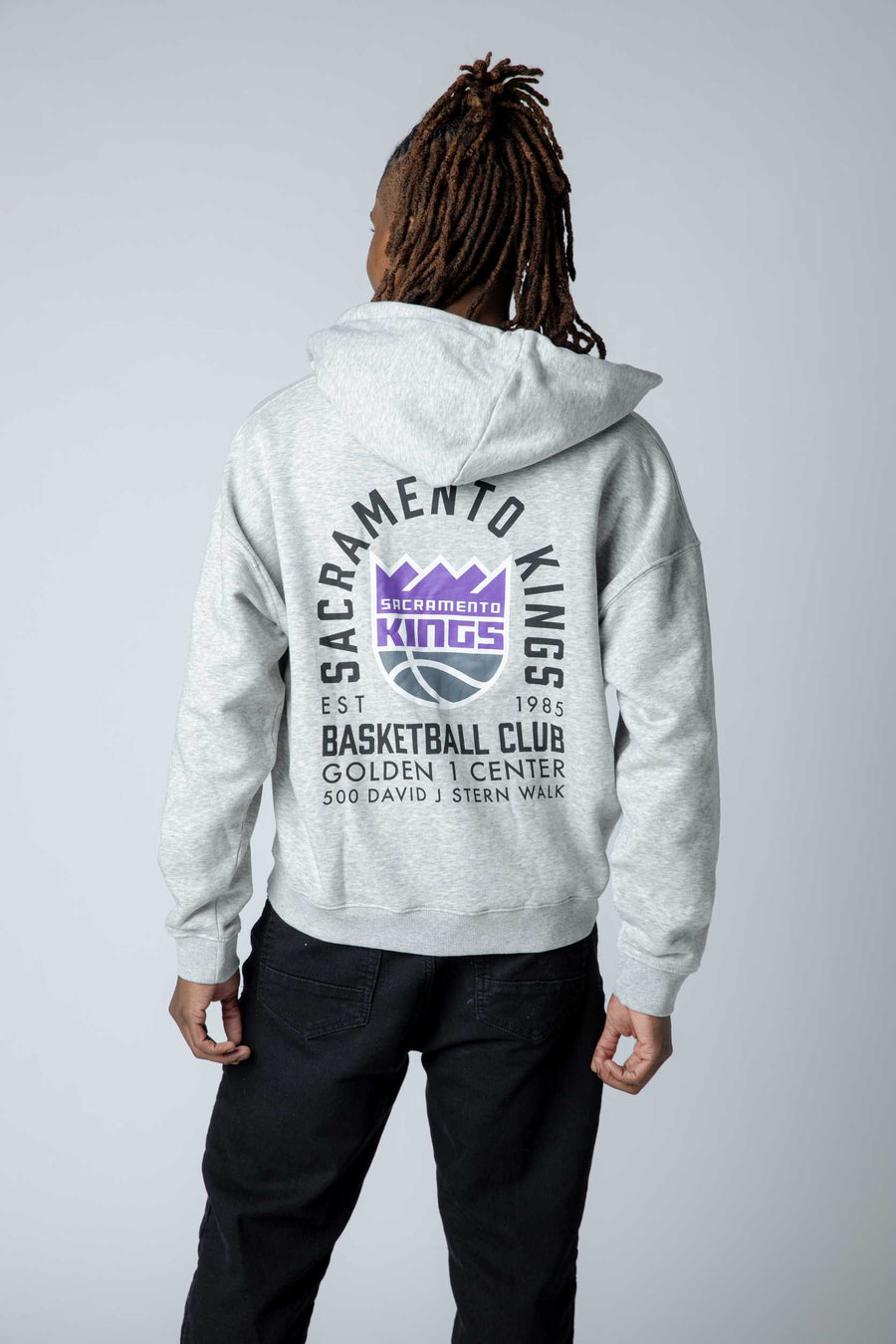 Rep your city in comfort and style with the Kings Team Full-Zip Hoodie. This premium gray layer features the Kings primary logo on the back, framed by stylized arched text for a bold, elevated look that stands out from every angle.