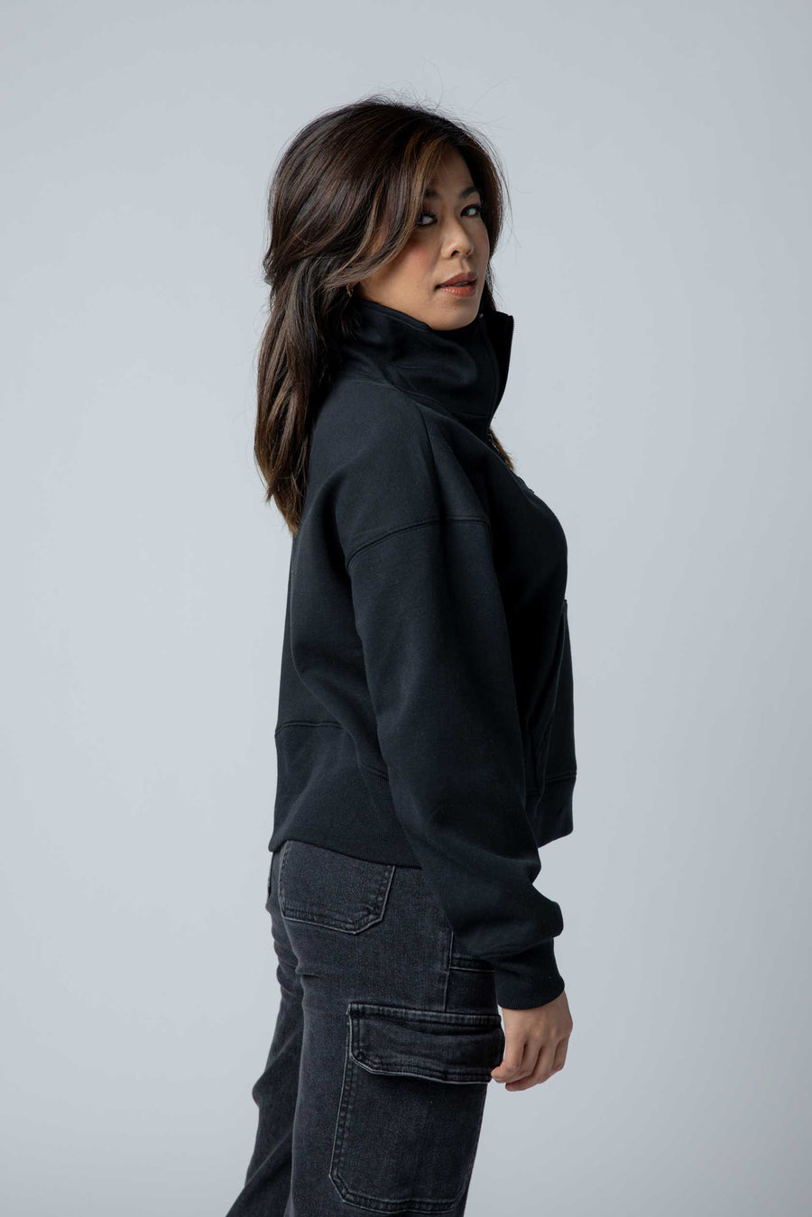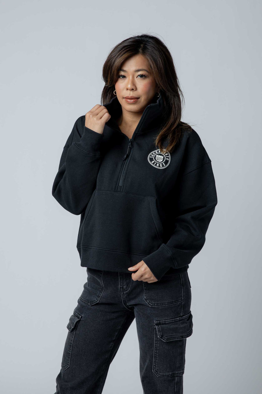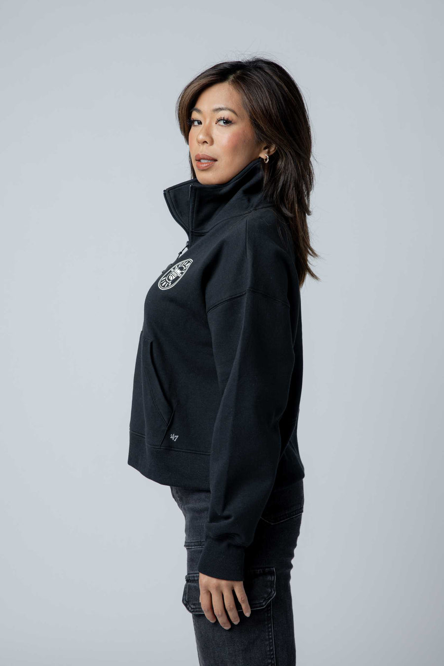 This cropped silhouette features a relaxed fit, ribbed cuffs and hem, and a quarter-zip neckline for versatile layering. Front and center is the iconic Sacramento Kings Primary logo, with an encompassing Sacramento Kings ring, bringing a royal edge to your everyday look.