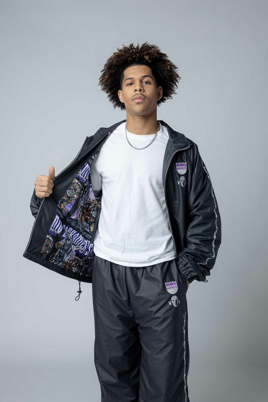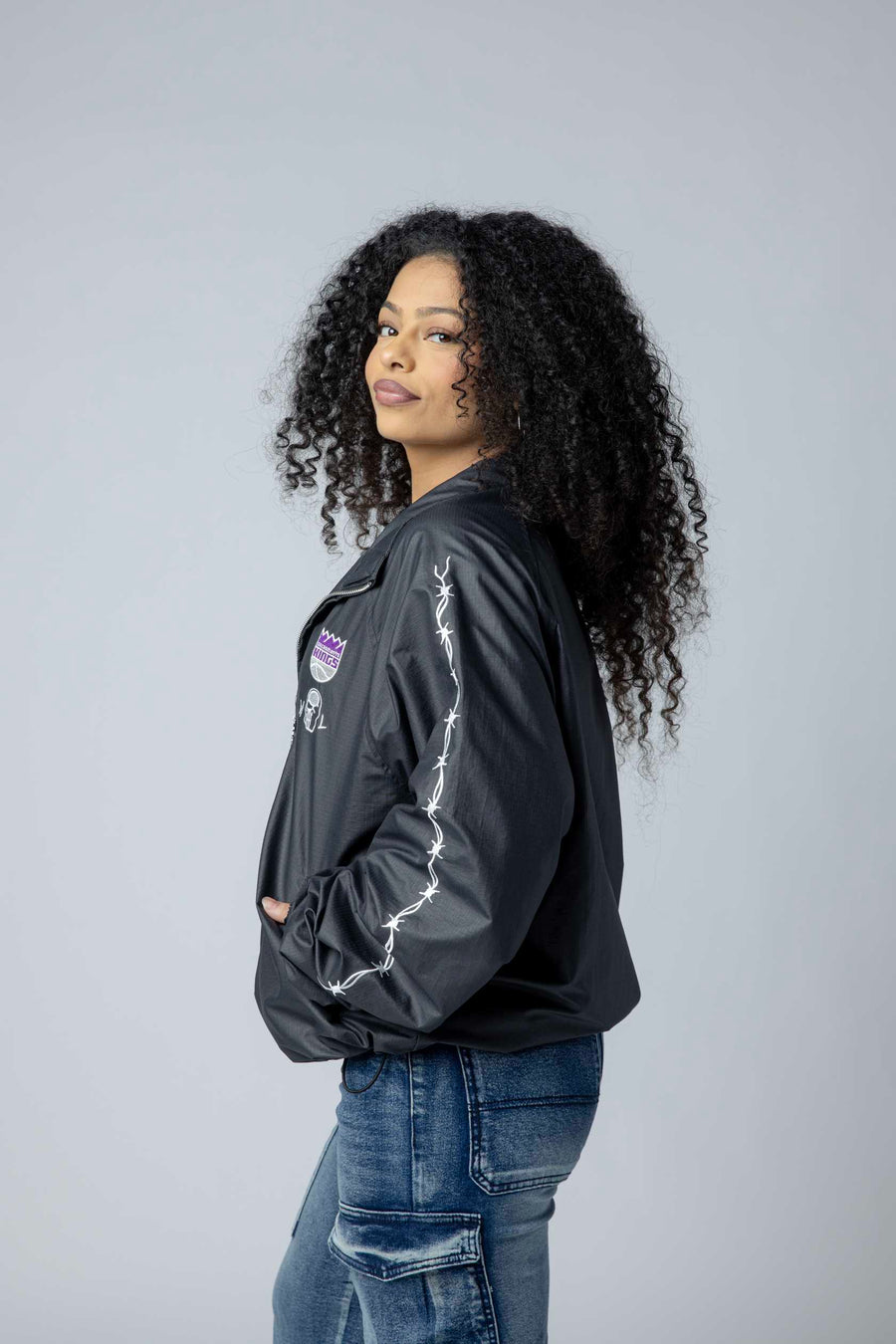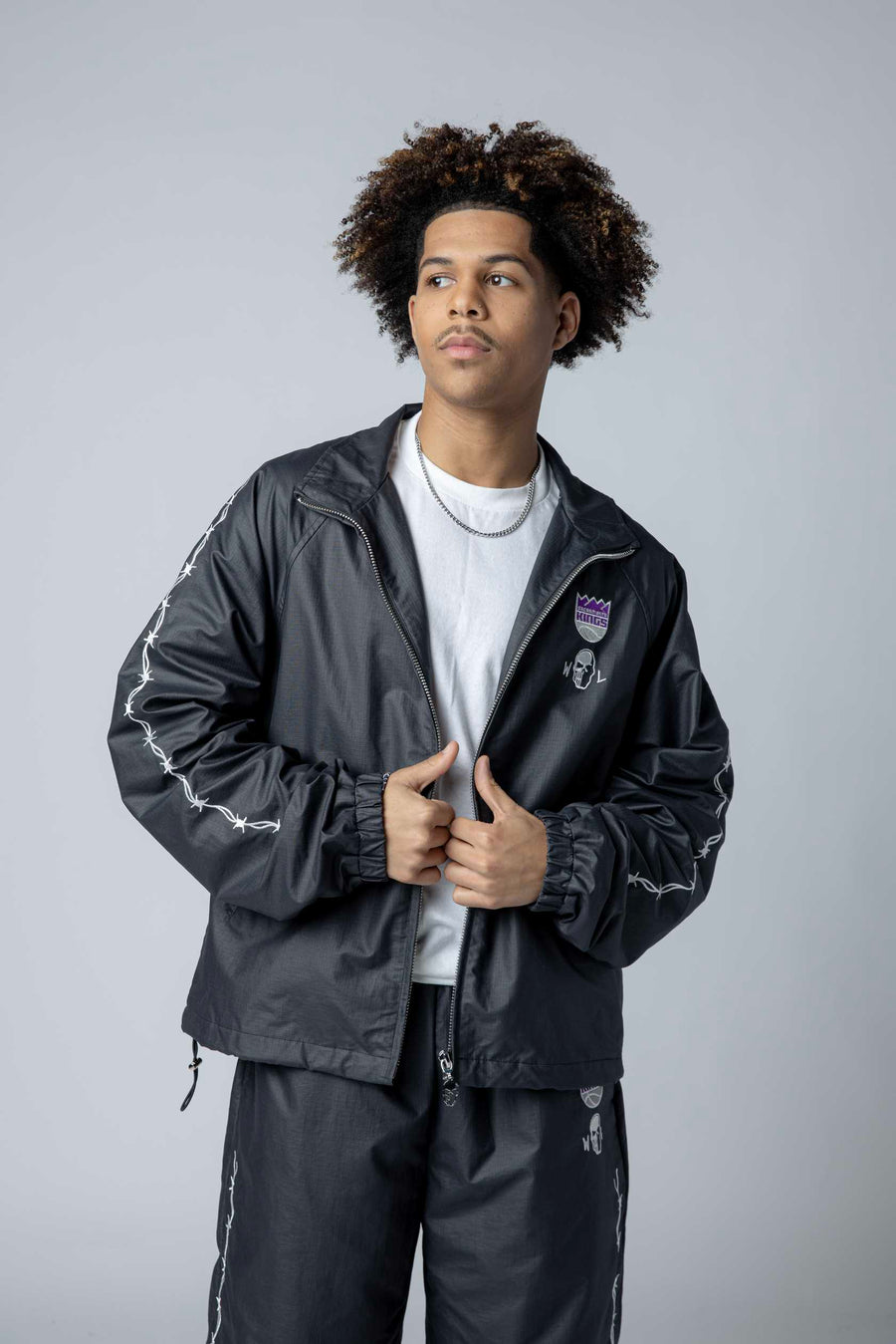 Kings Barbed Wire Nylon Jacket Exclusive collaboration between Warren Lotas and the Sacramento Kings. This striking nylon jacket features the Kings Primary logo and Warren Lotas branding on the front left chest, with signature embroidered barbed wire print running down both sleeves. Built for fans who want bold, statement-making style that celebrates both the team and the designer's iconic aesthetic. Durable nylon construction ensures lasting wear through seasons of game days and everyday wear.