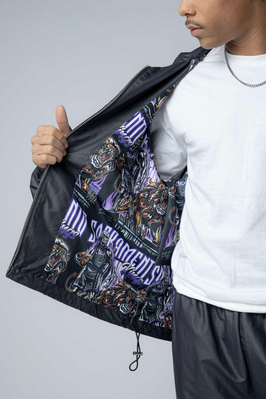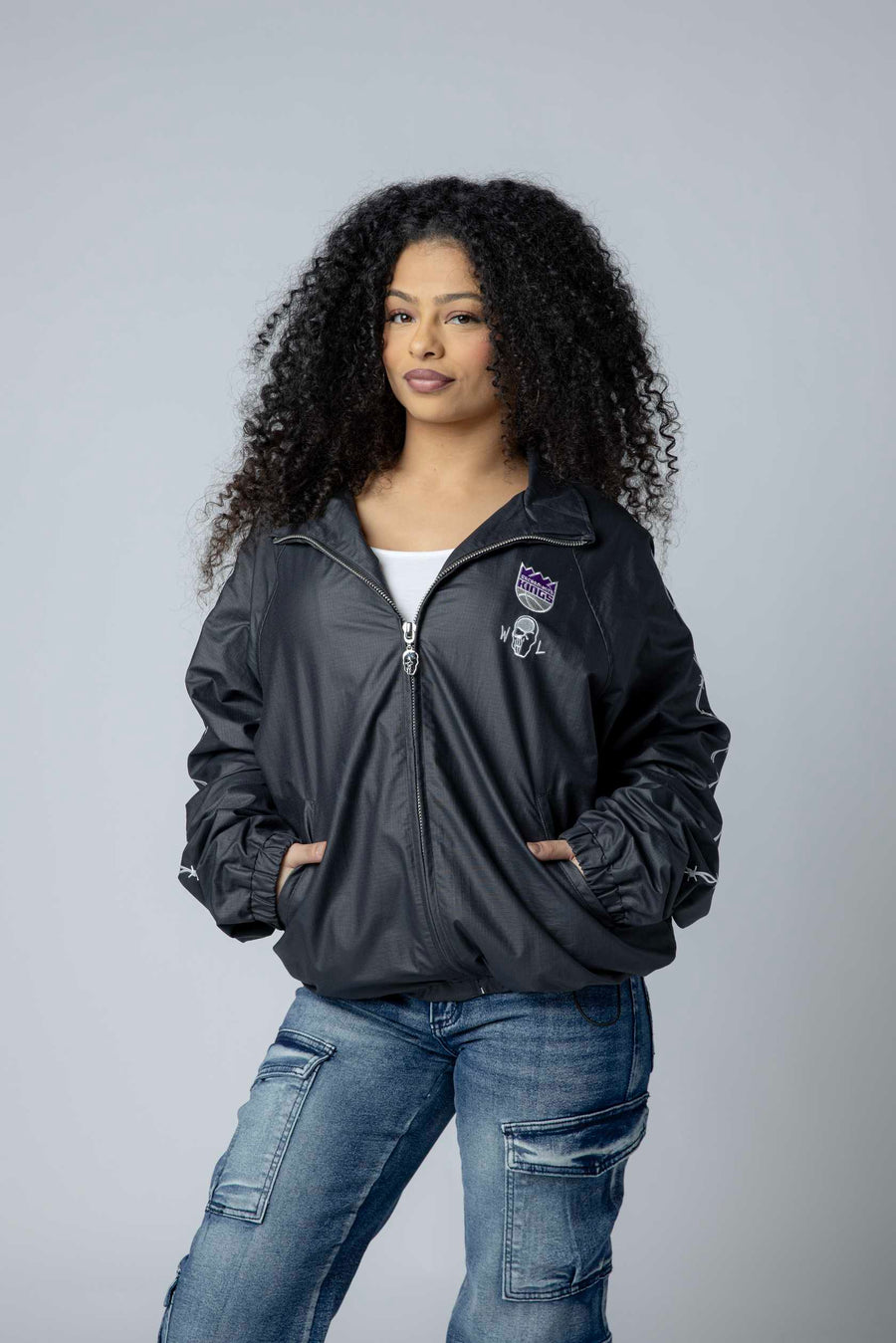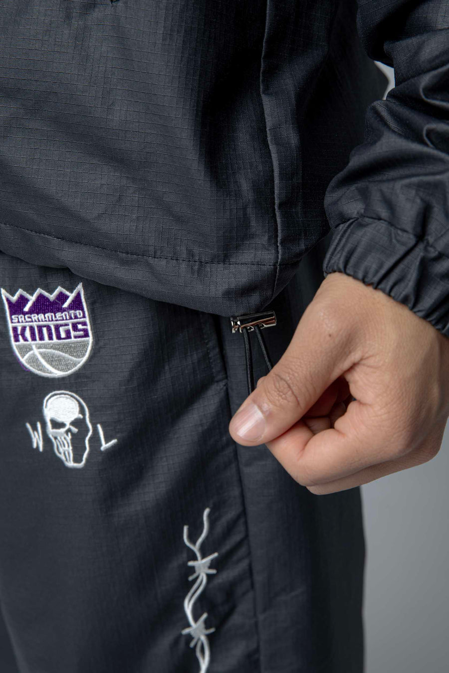 Kings Barbed Wire Nylon Jacket Exclusive collaboration between Warren Lotas and the Sacramento Kings. This striking nylon jacket features the Kings Primary logo and Warren Lotas branding on the front left chest, with signature embroidered barbed wire print running down both sleeves. Built for fans who want bold, statement-making style that celebrates both the team and the designer's iconic aesthetic. Durable nylon construction ensures lasting wear through seasons of game days and everyday wear.