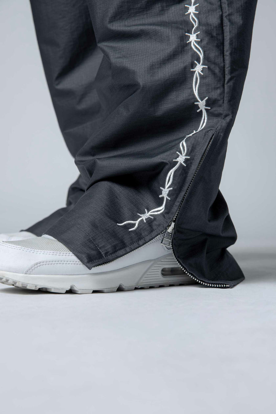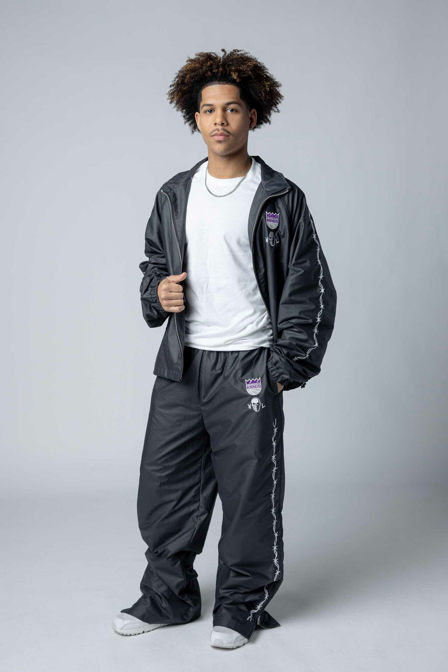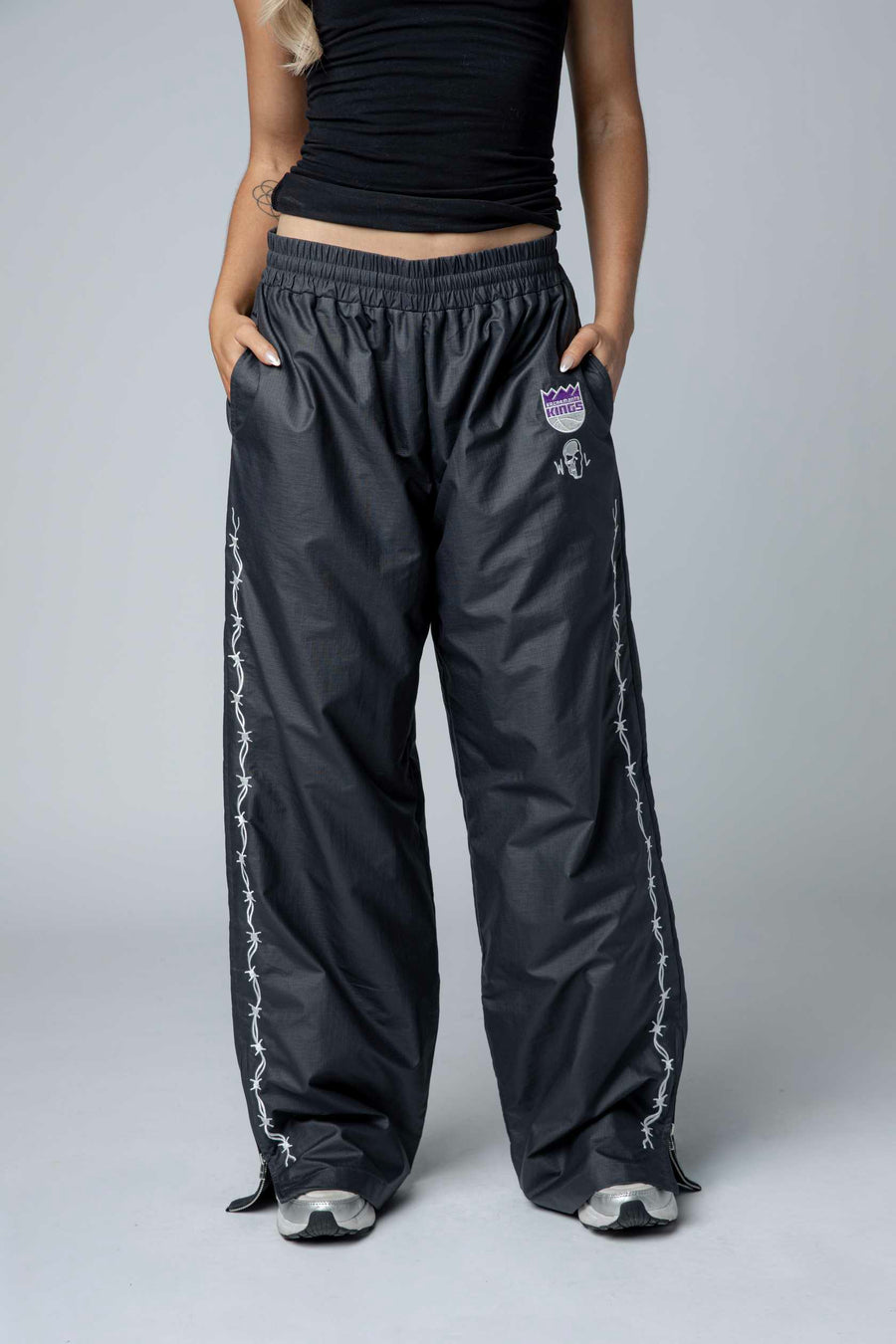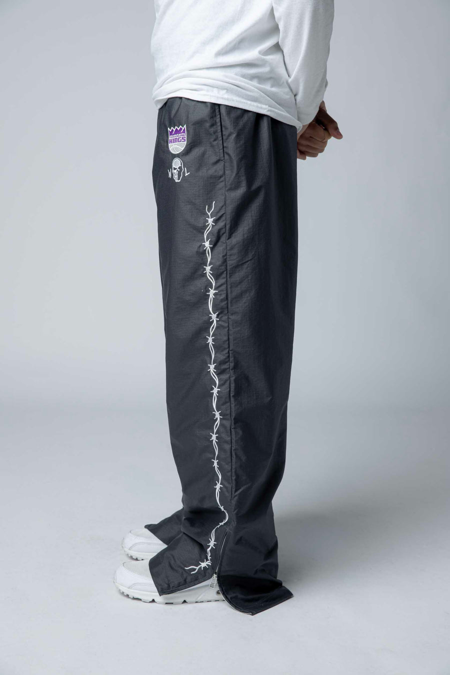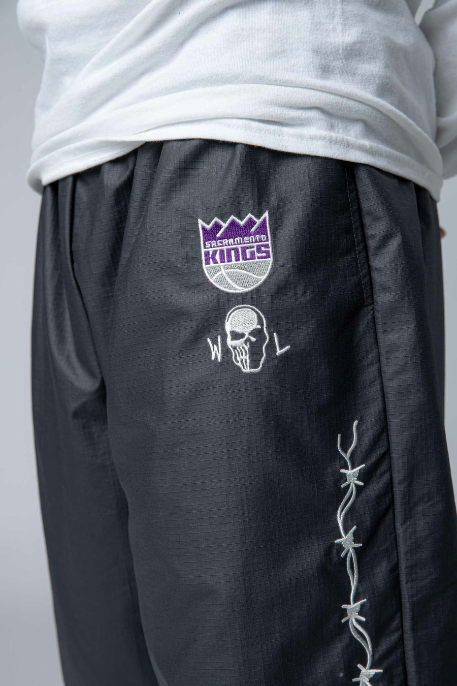Kings Barbed Wire Nylon Pants deliver bold streetwear style with a relaxed baggy fit. Featuring the Sacramento Kings Primary Logo alongside the Warren Lotas signature, these pants showcase an edgy embroidered barbed wire running down each leg. Crafted from durable nylon, they're designed for fans who want premium team gear with contemporary attitude. Perfect for game day or everyday wear.